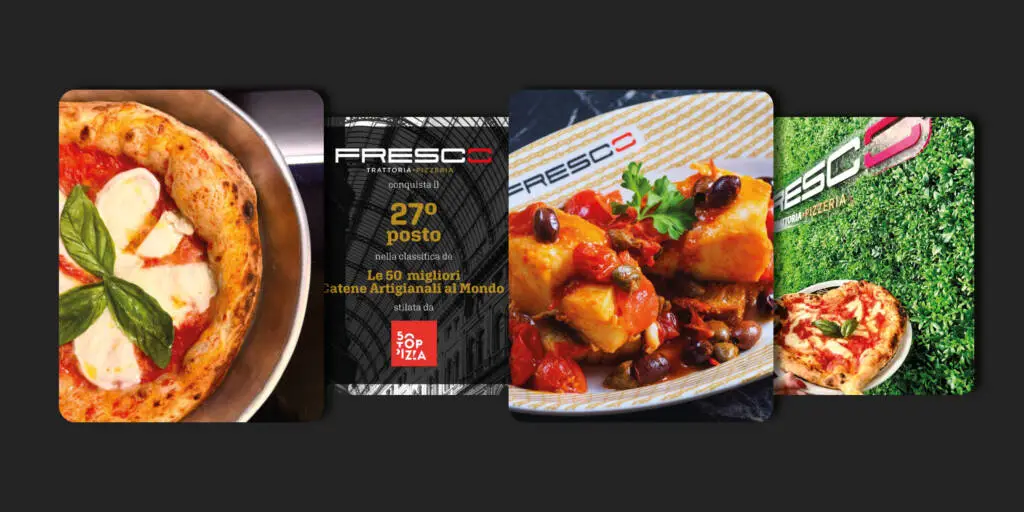 Fresco Trattoria Pizzeria è un format di cucina e pizza tipica napoletana che ha conquistato oltre 20 sedi in Italia e in Europa, portando i sapori autentici di Napoli a un pubblico internazionale. Per Fresco abbiamo realizzato un rebranding completo, ridefinendo la corporate identity per esprimere al meglio la qualità e l’autenticità della tradizione napoletana, adattandola alle esigenze di un mercato globale.